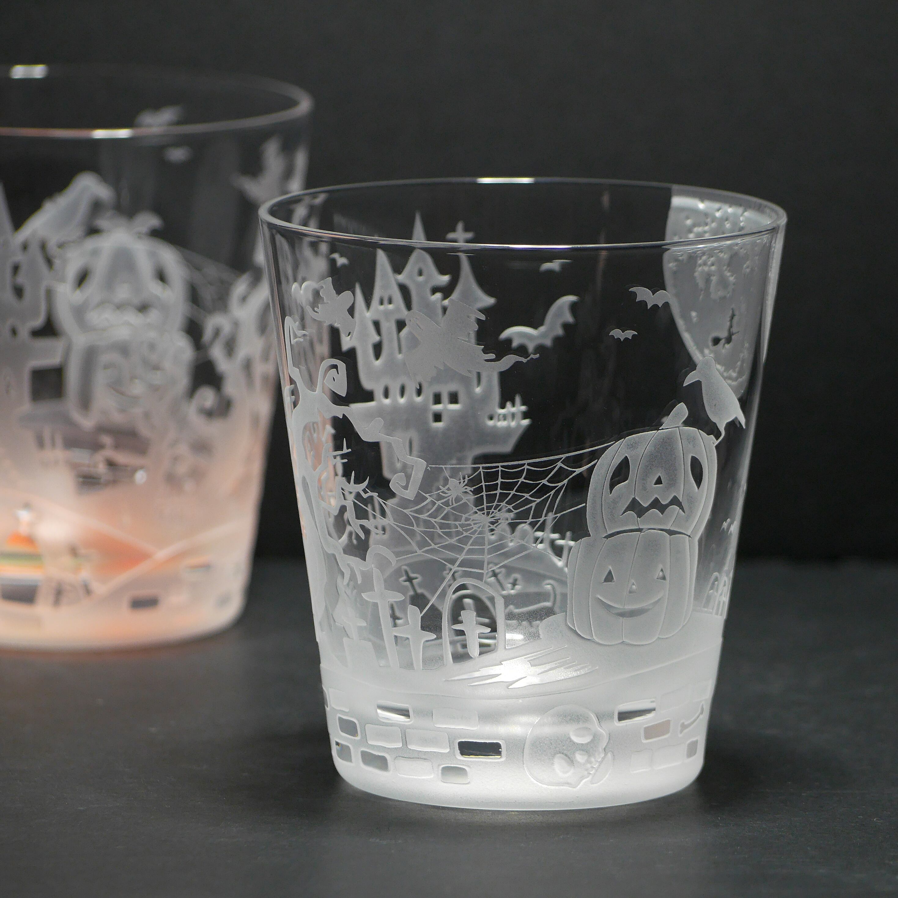 サンドブラスト彫刻の多彩な技法を駆使し、ハロウィンの不思議で幻想的な世界観をグラスに表現しました。