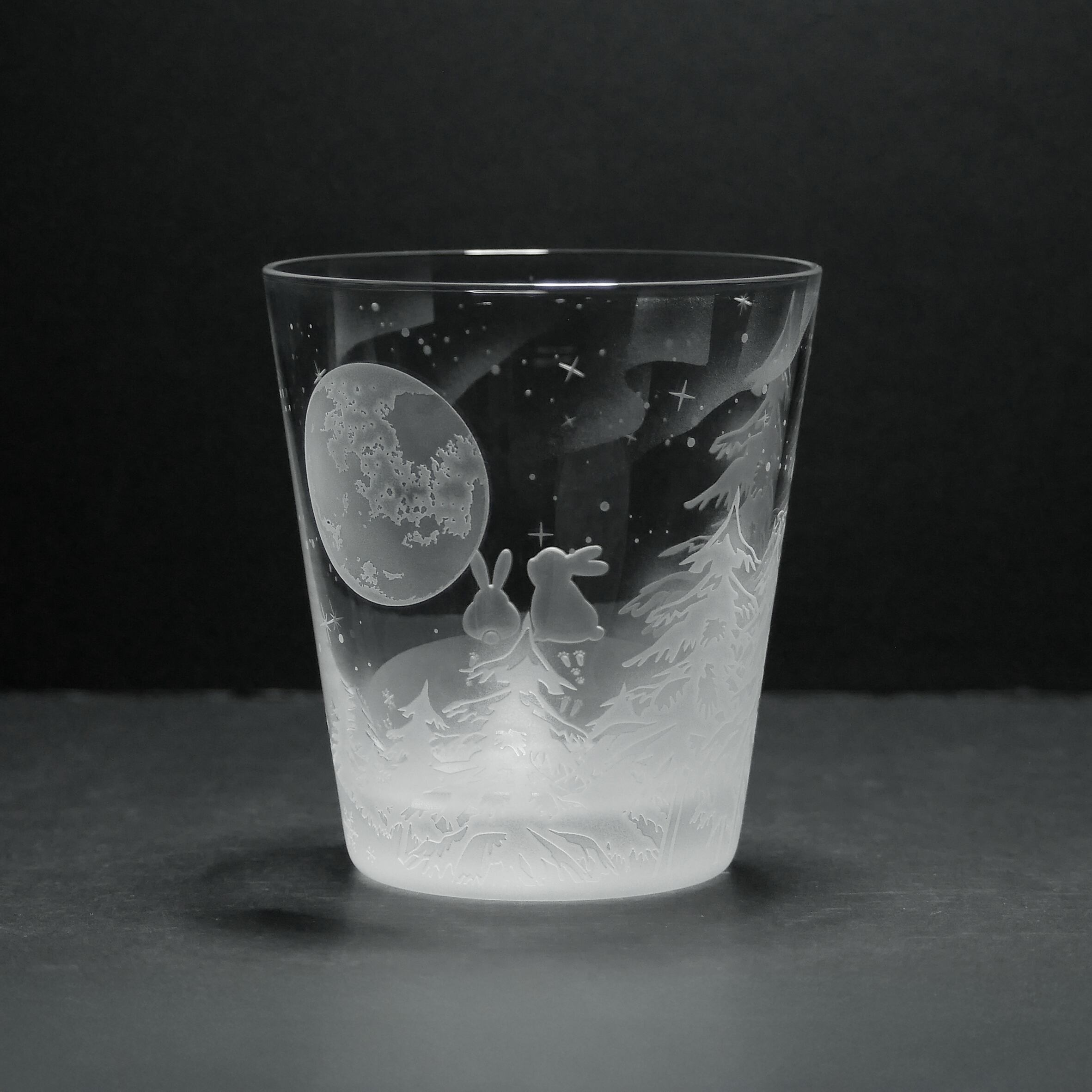 グラスの奥行きを活かした立体的なデザインの中に、月を見上げる兎の姿を表現しました。
