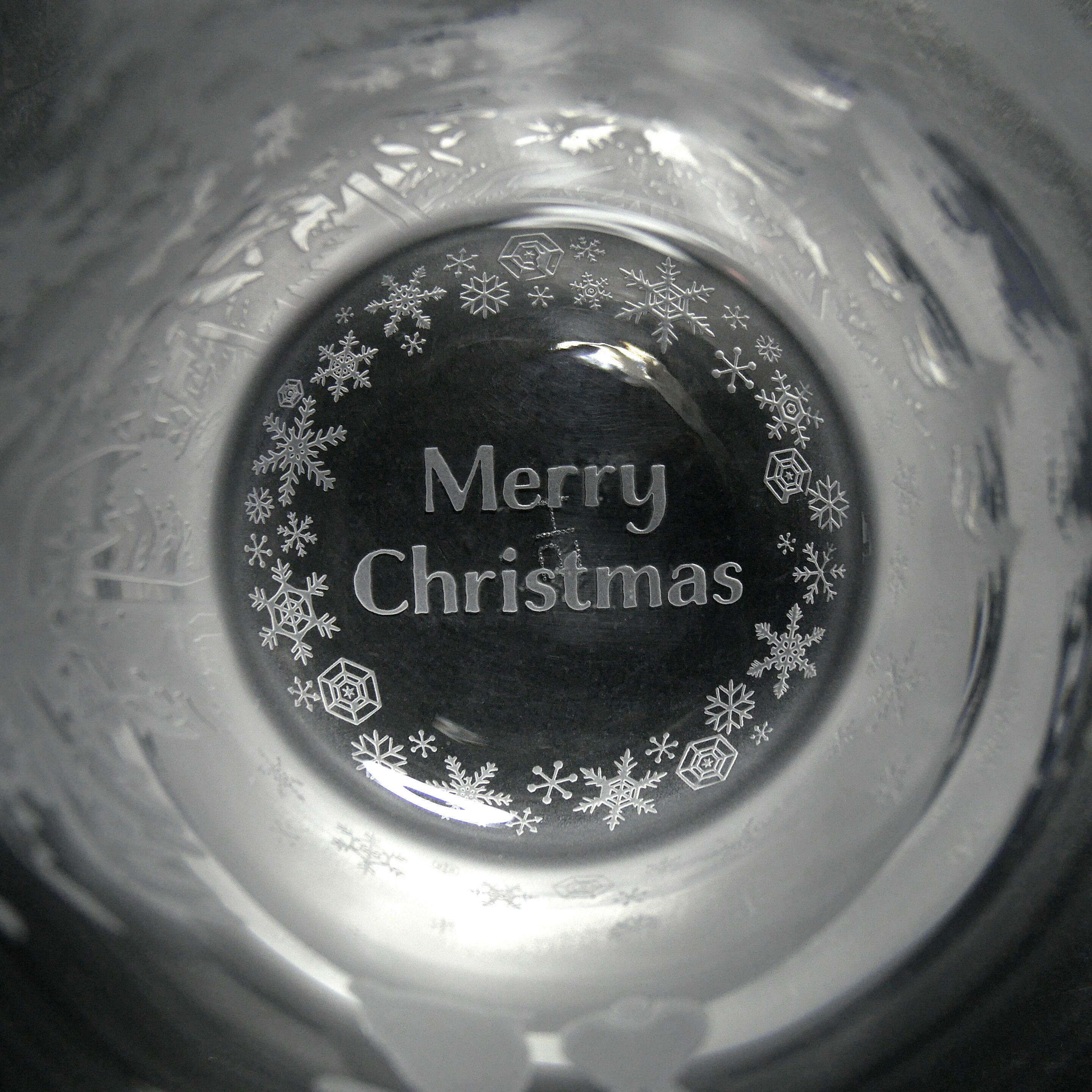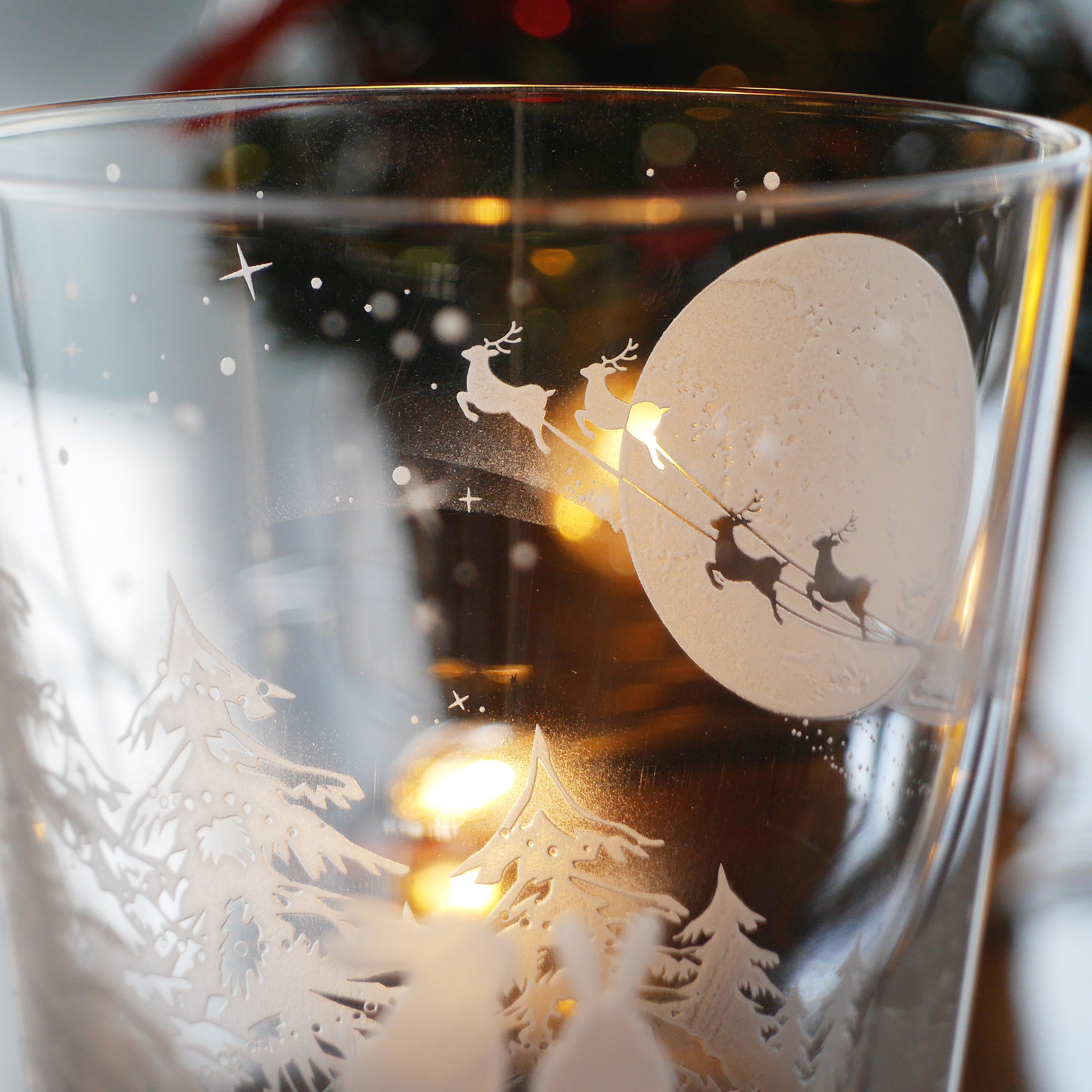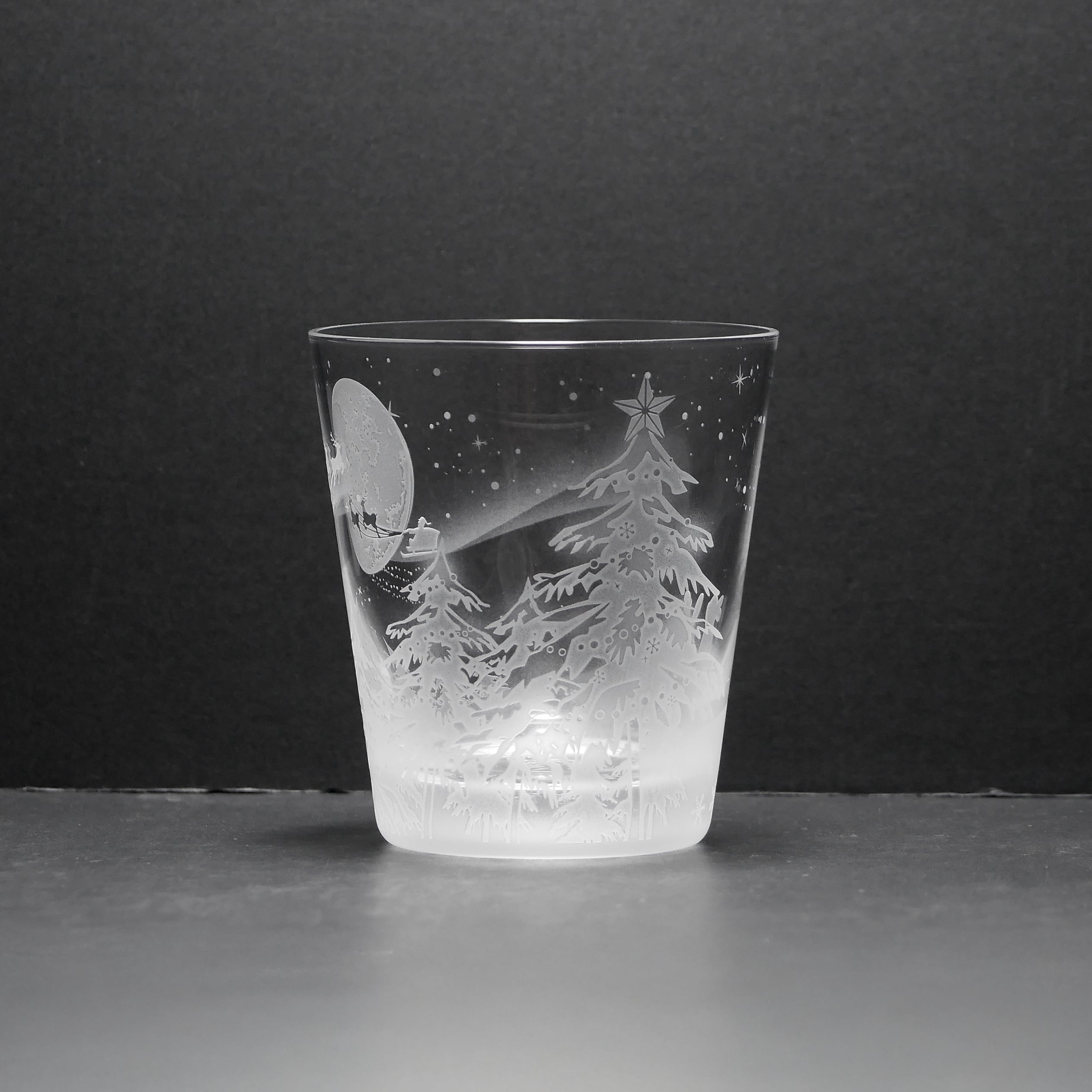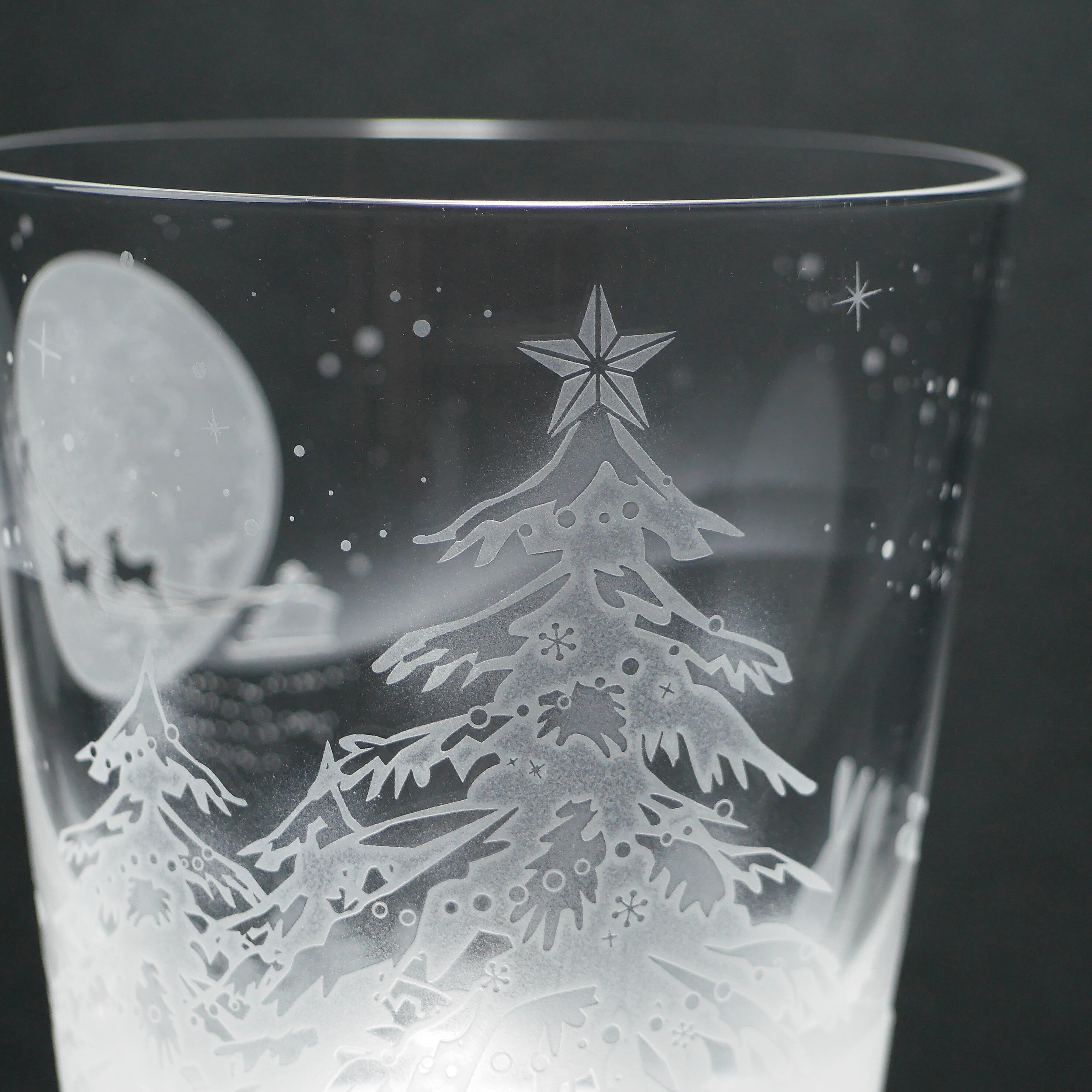 幻想的で可愛らしい月兎グラスの世界観はそのままに、大きくそびえるクリスマスツリーと、輝く満月を背景に夜空を駆けるサンタクロースのシルエットをサンドブラスト彫刻で施しました。