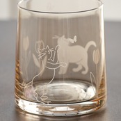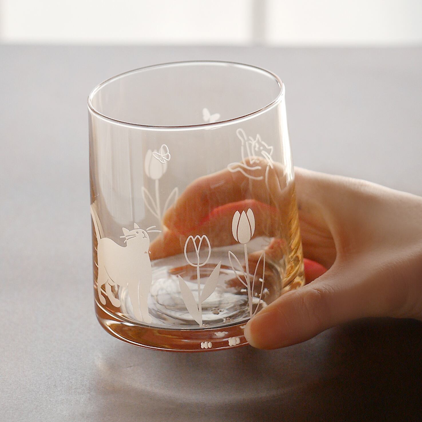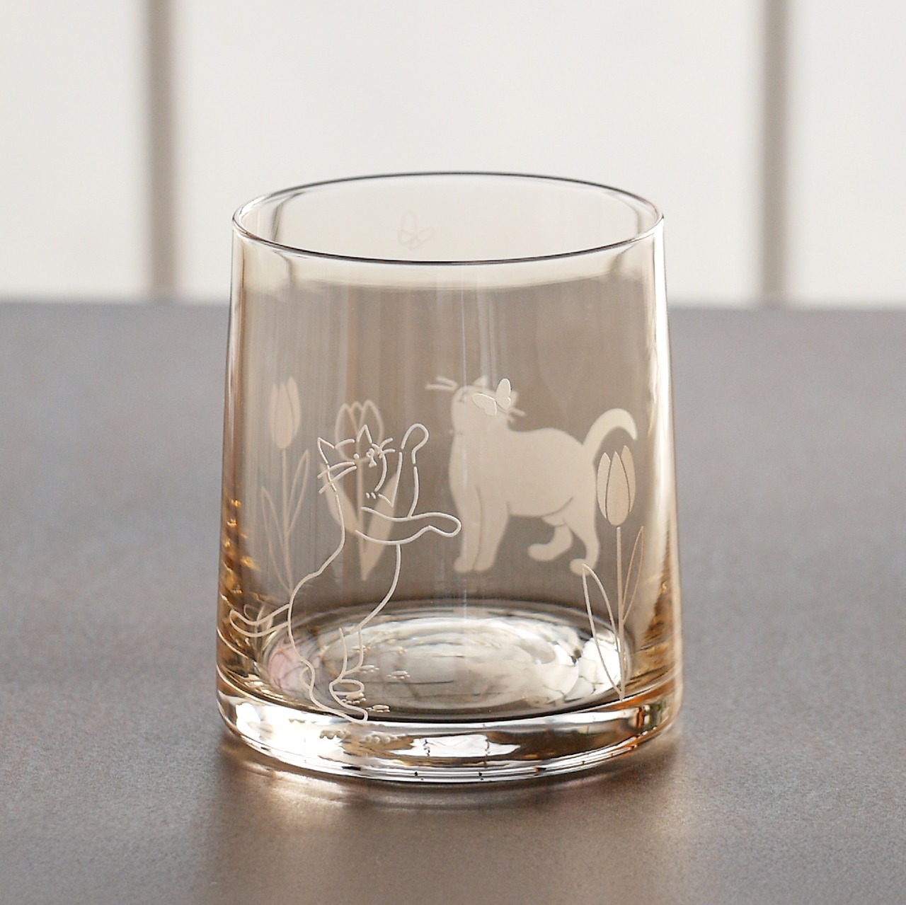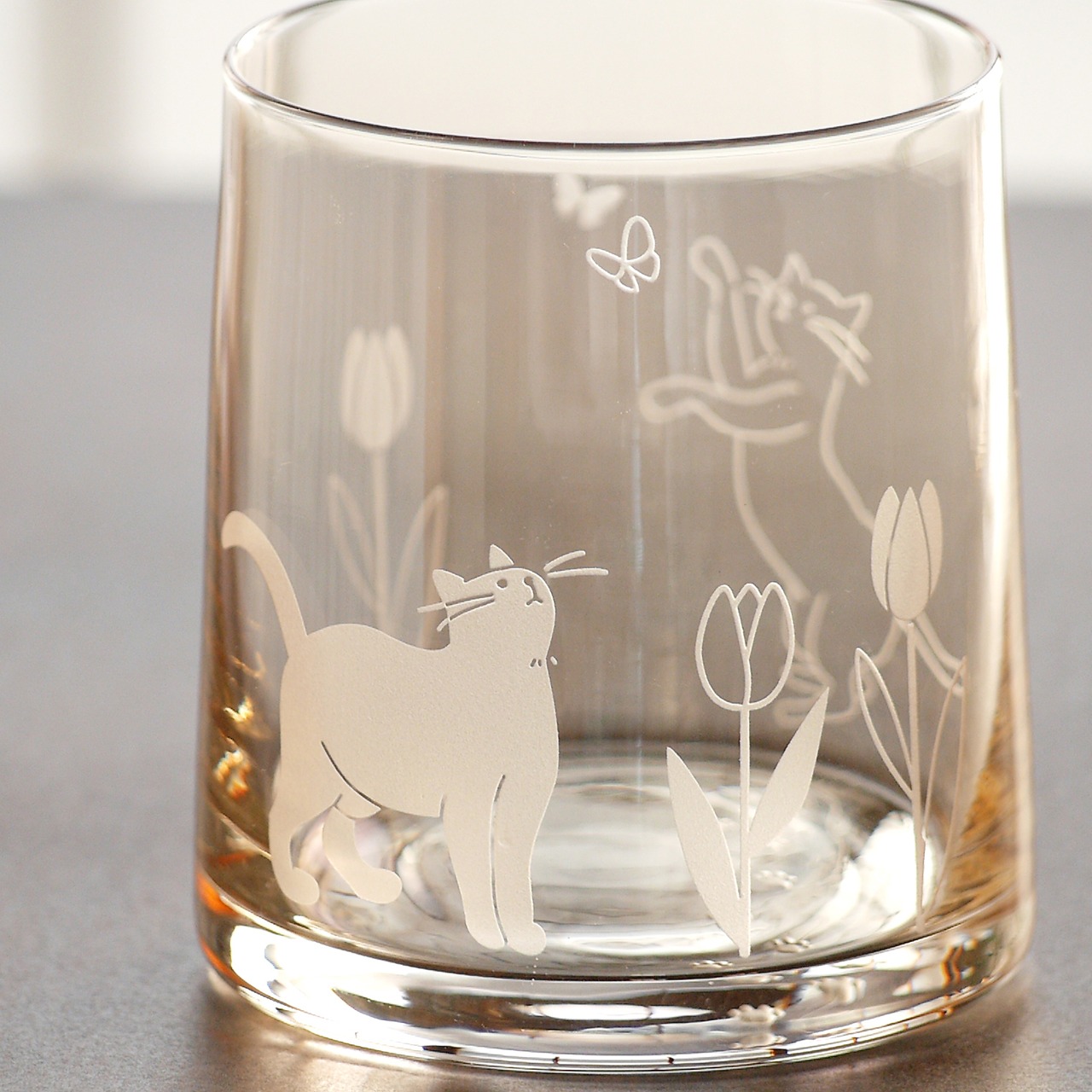 蝶と戯れる可愛い猫とチューリップのイラストをサンドブラスト彫刻したグラスです。