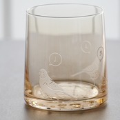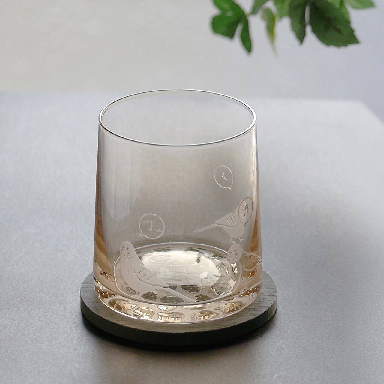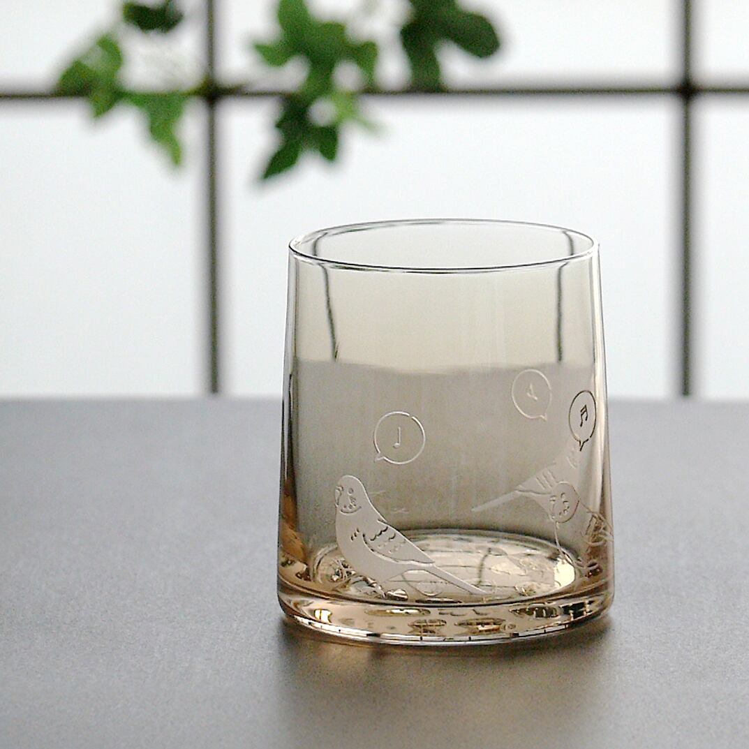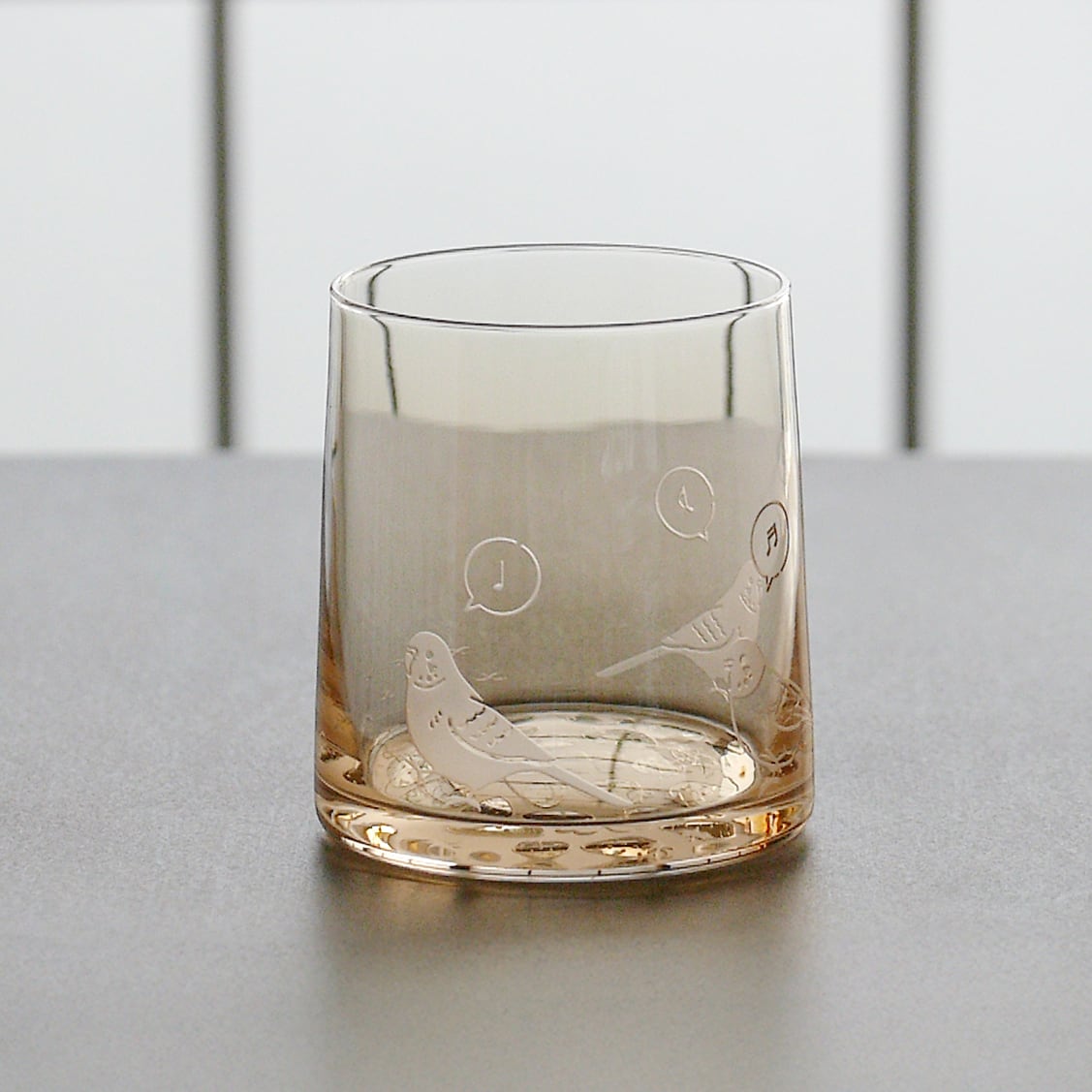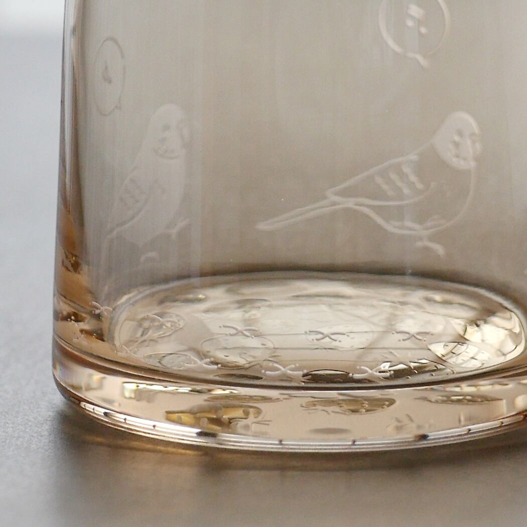 ごきげんな3羽のセキセイインコが可愛らしい、サンドブラスト彫刻のグラスです。