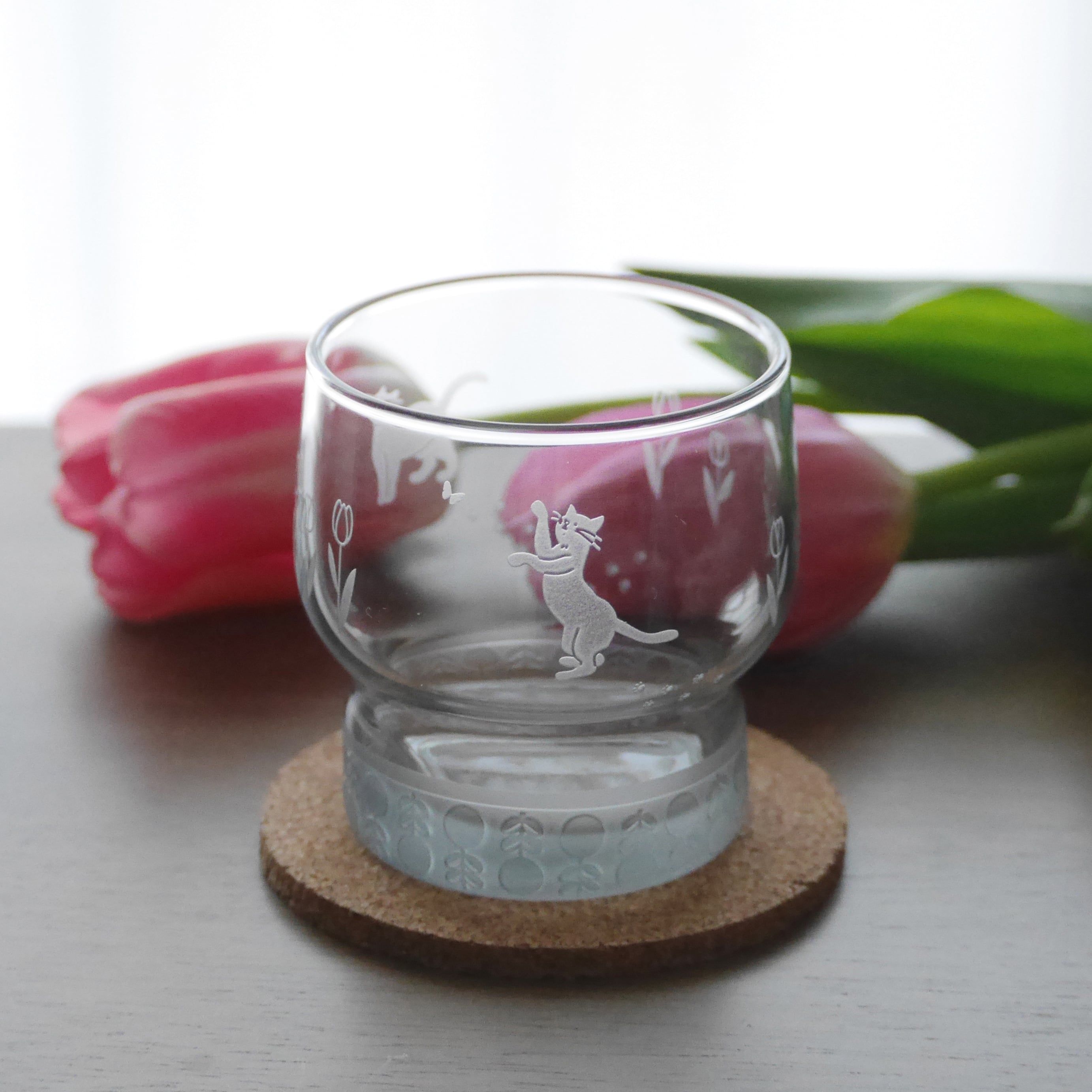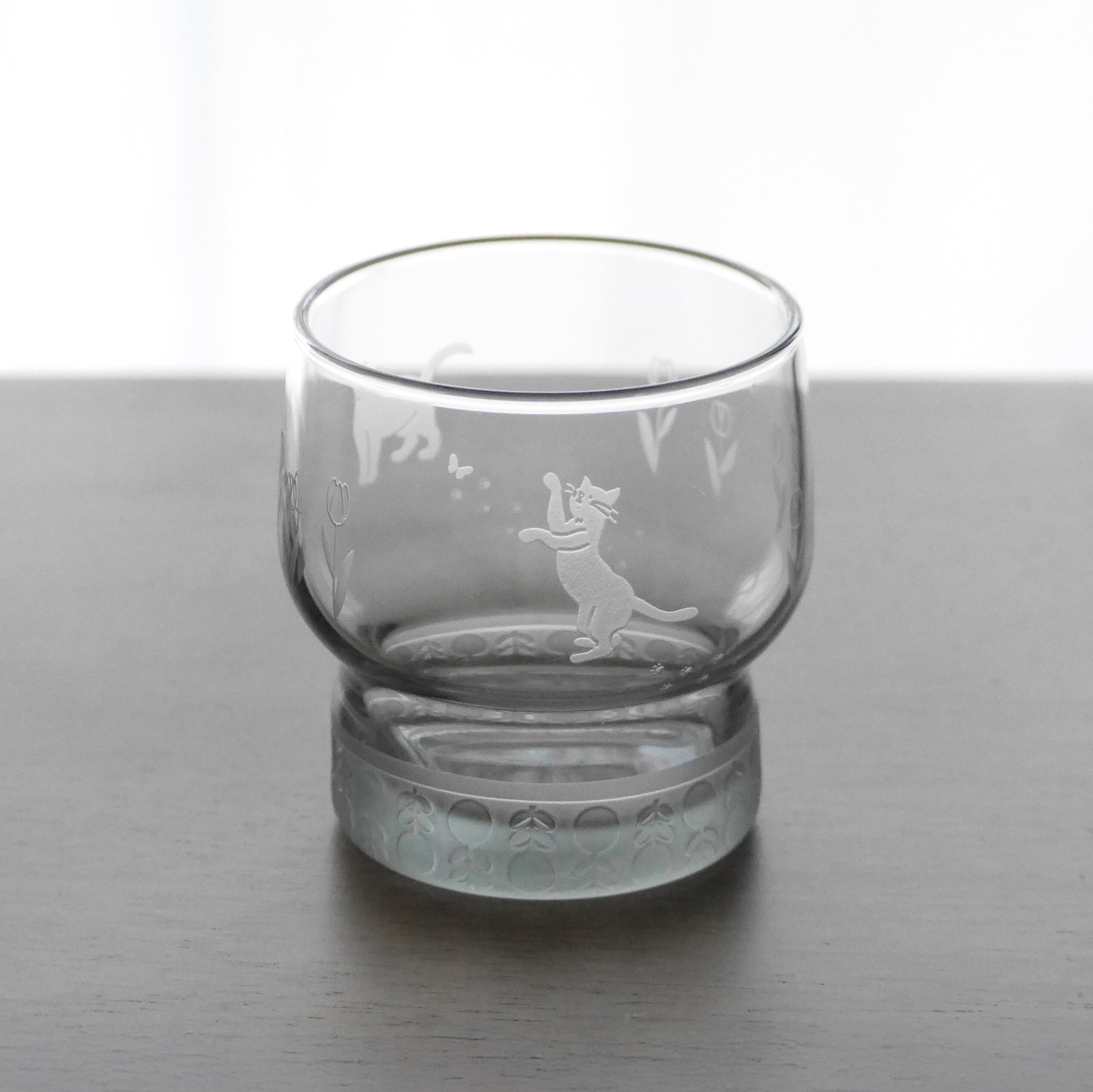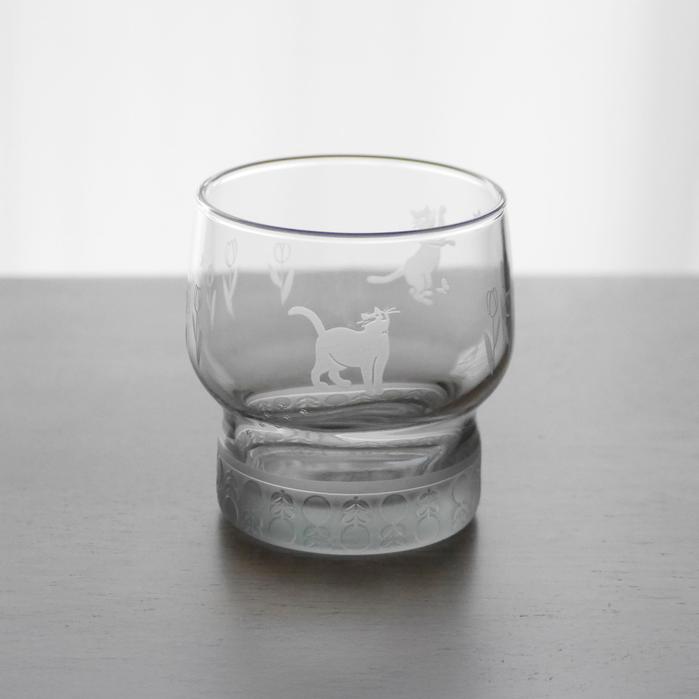 落ち着きのあるグレーのグラスに、サンドブラスト加工で猫とチューリップのモチーフを丁寧に彫刻しました。