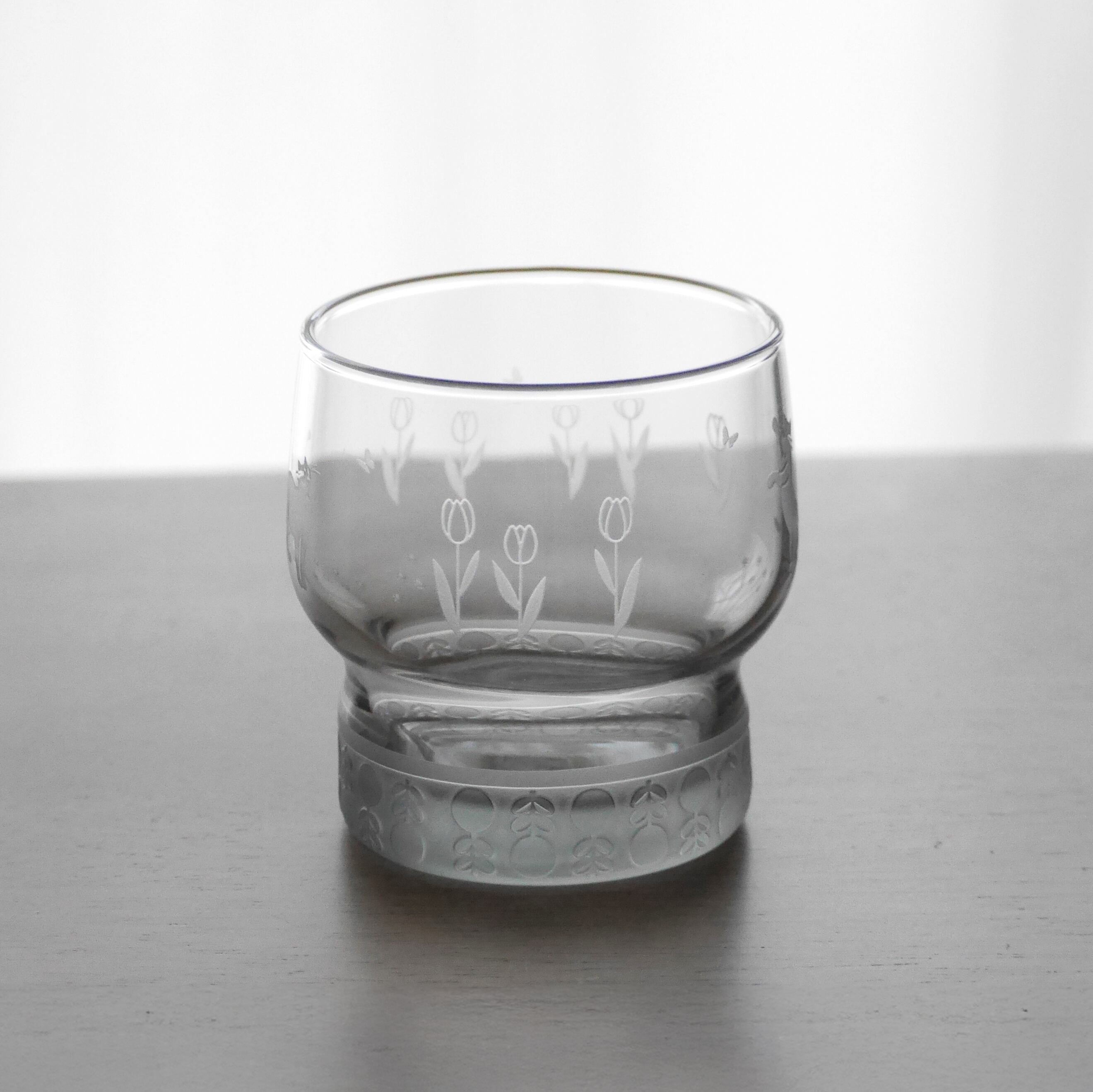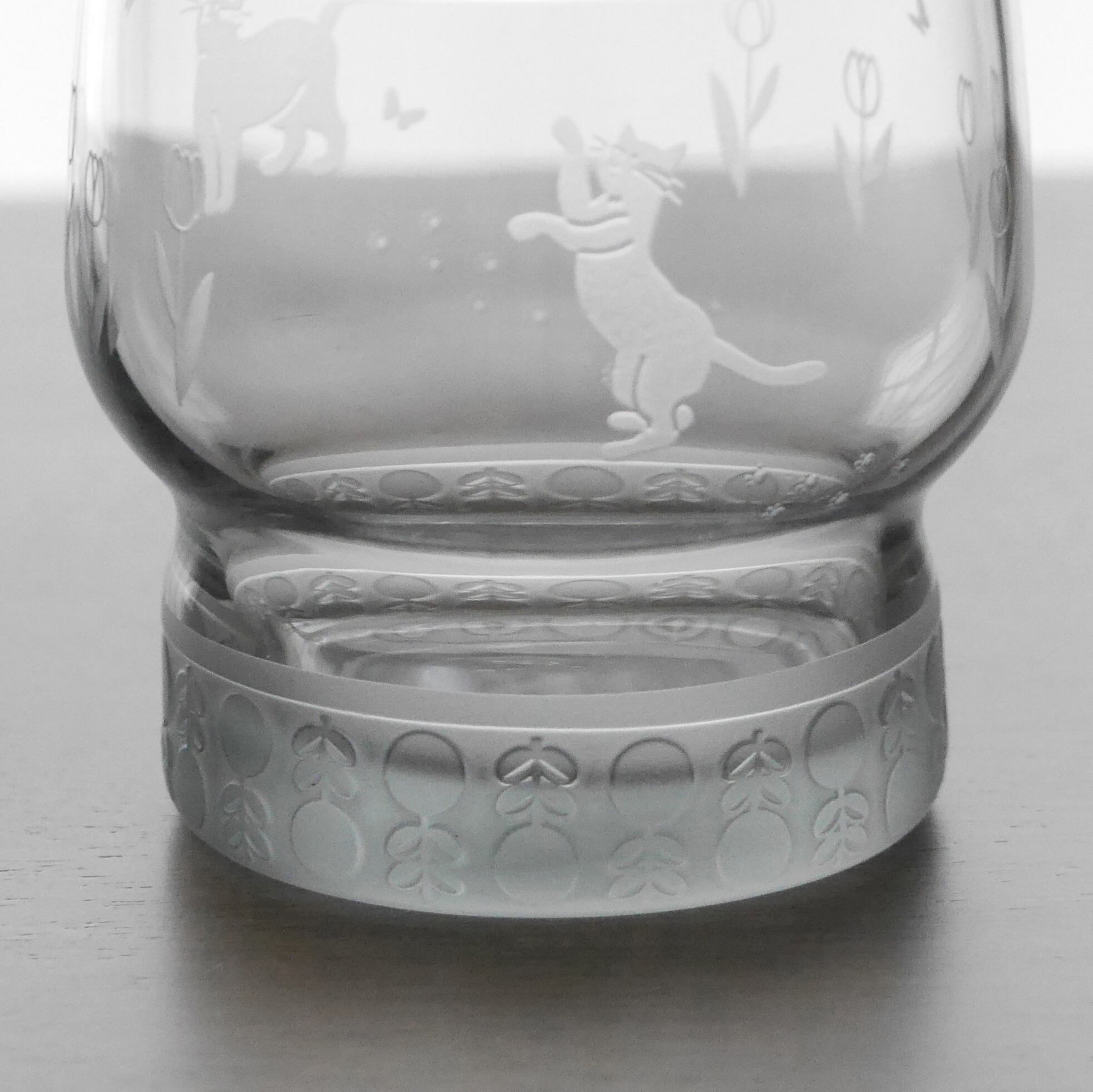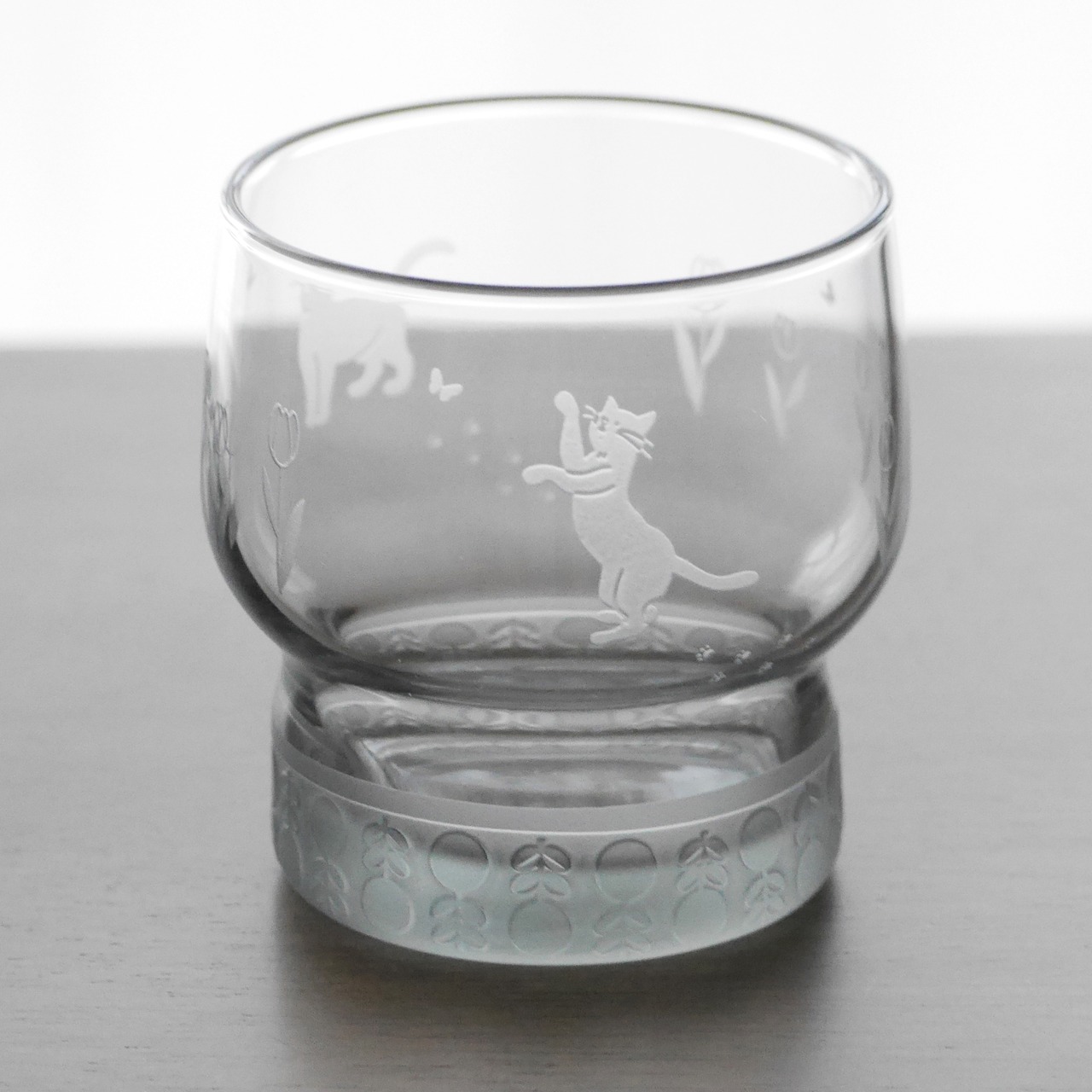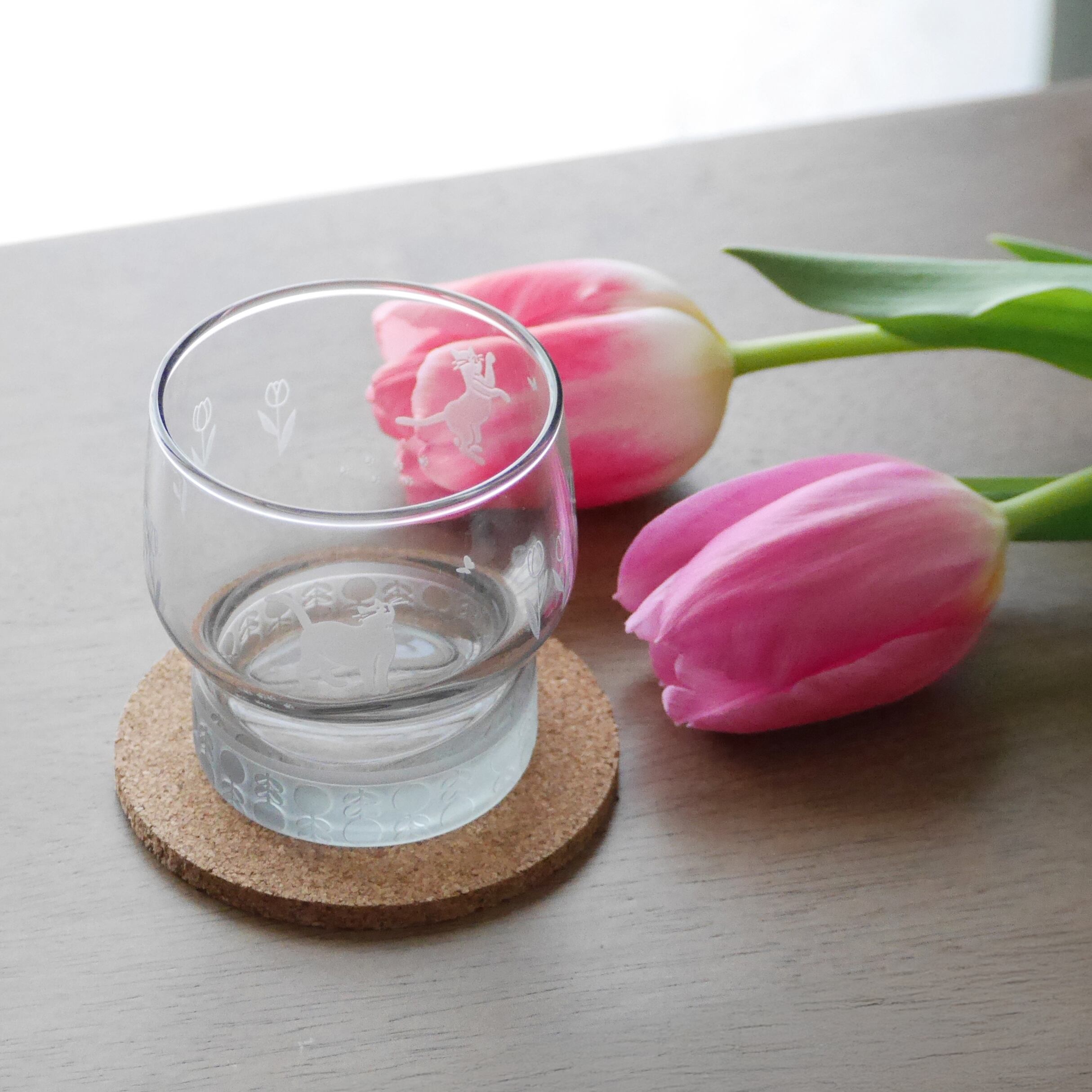 落ち着きのあるグレーのグラスに、サンドブラスト加工で猫とチューリップのモチーフを丁寧に彫刻しました。