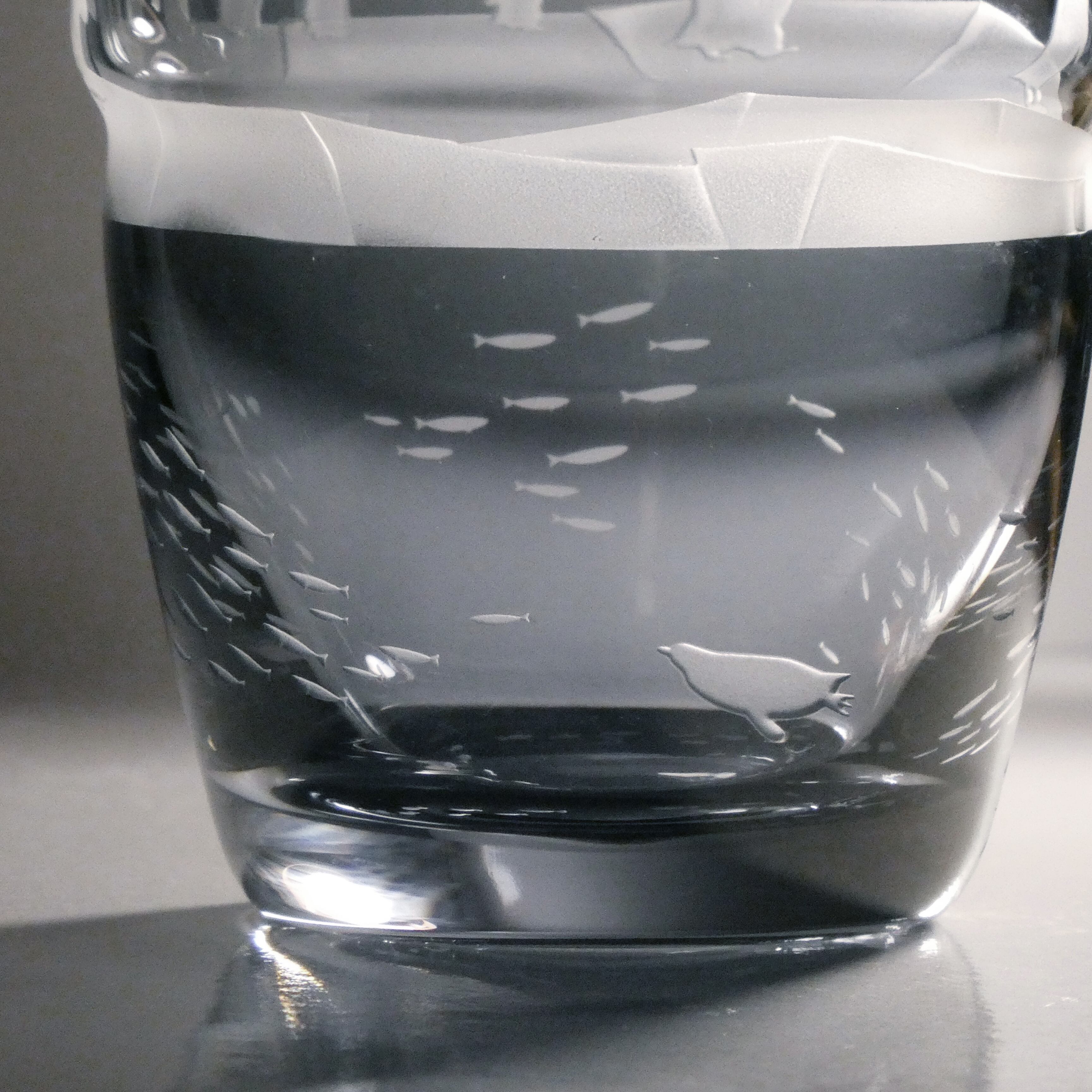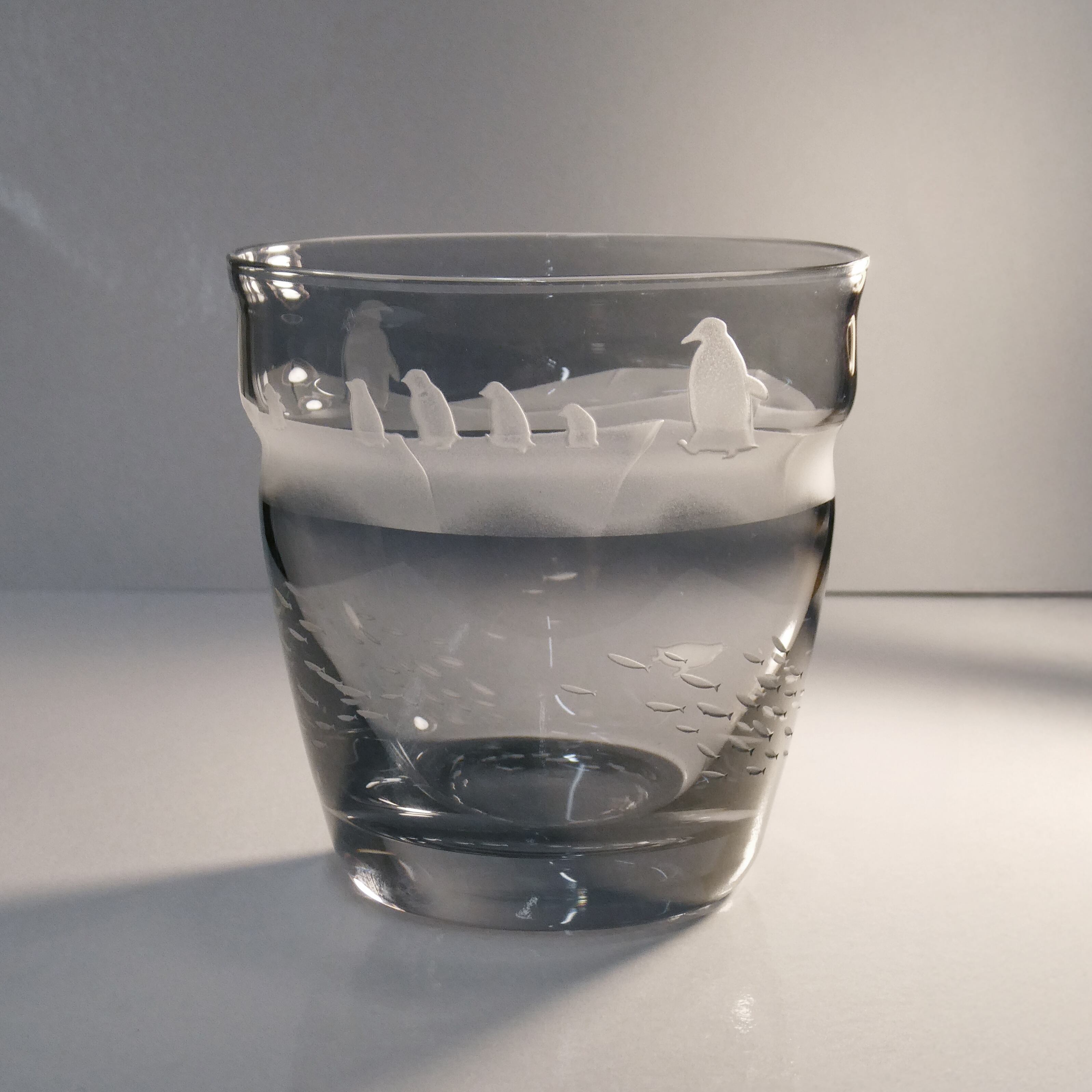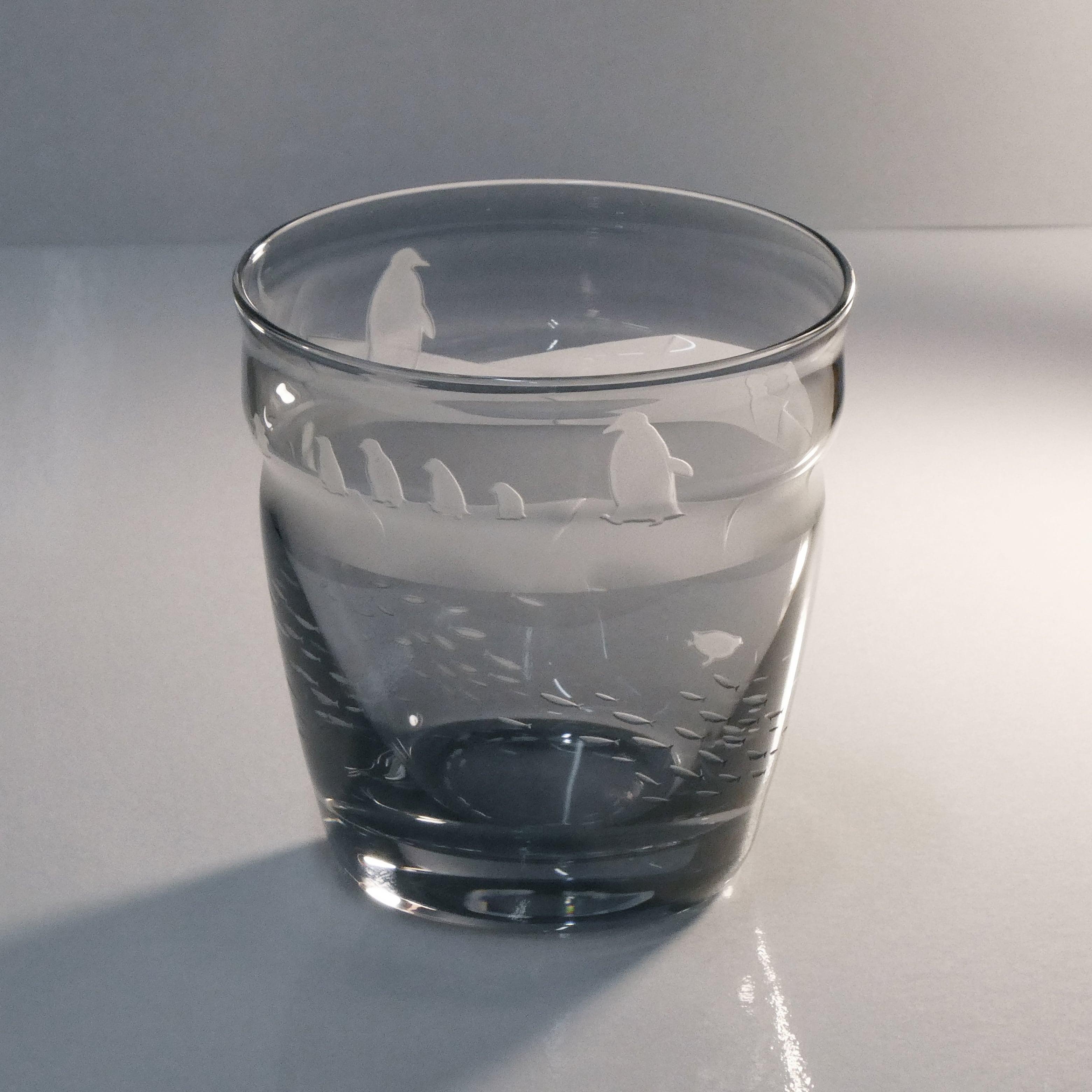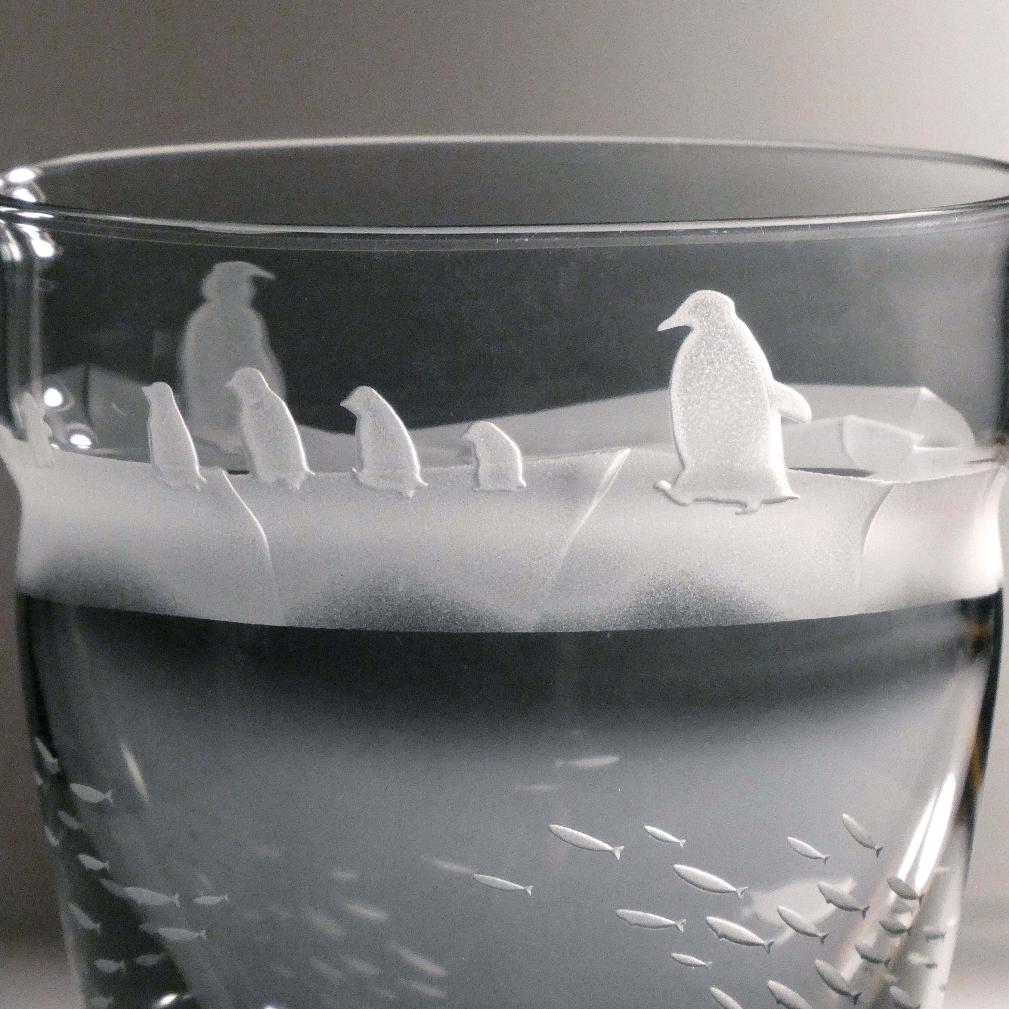 微笑ましいペンギンの親子の姿が、繊細なサンドブラスト技法で丁寧に彫刻されたグラスです。
